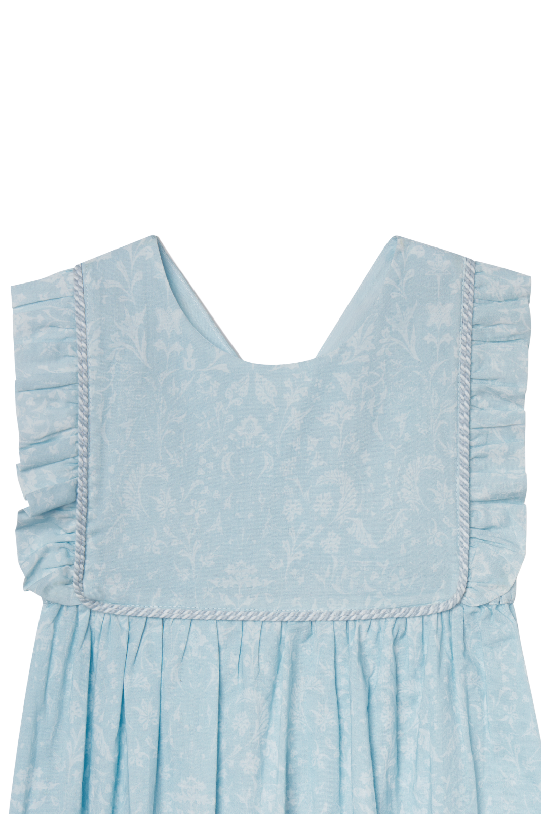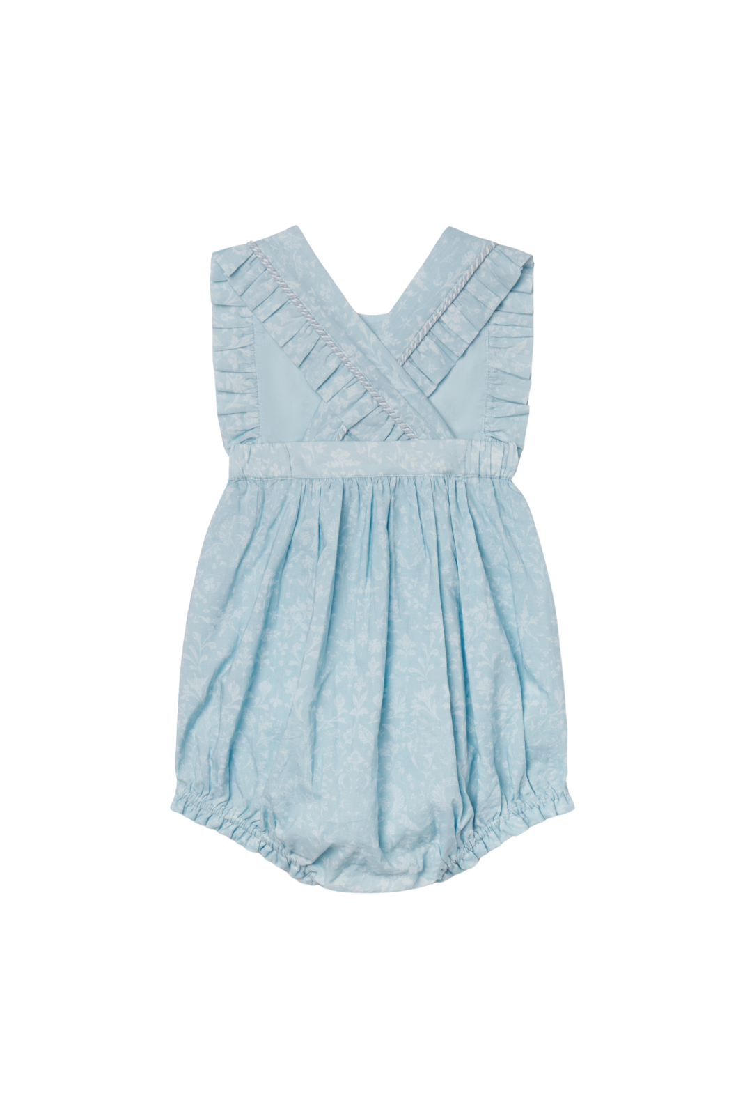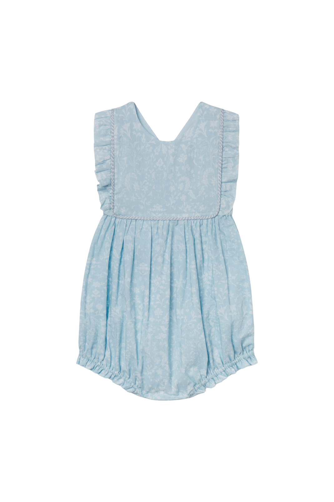 Blue and white floral onesie with a ruffled bib and straps