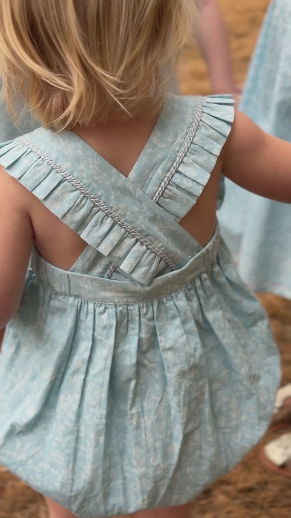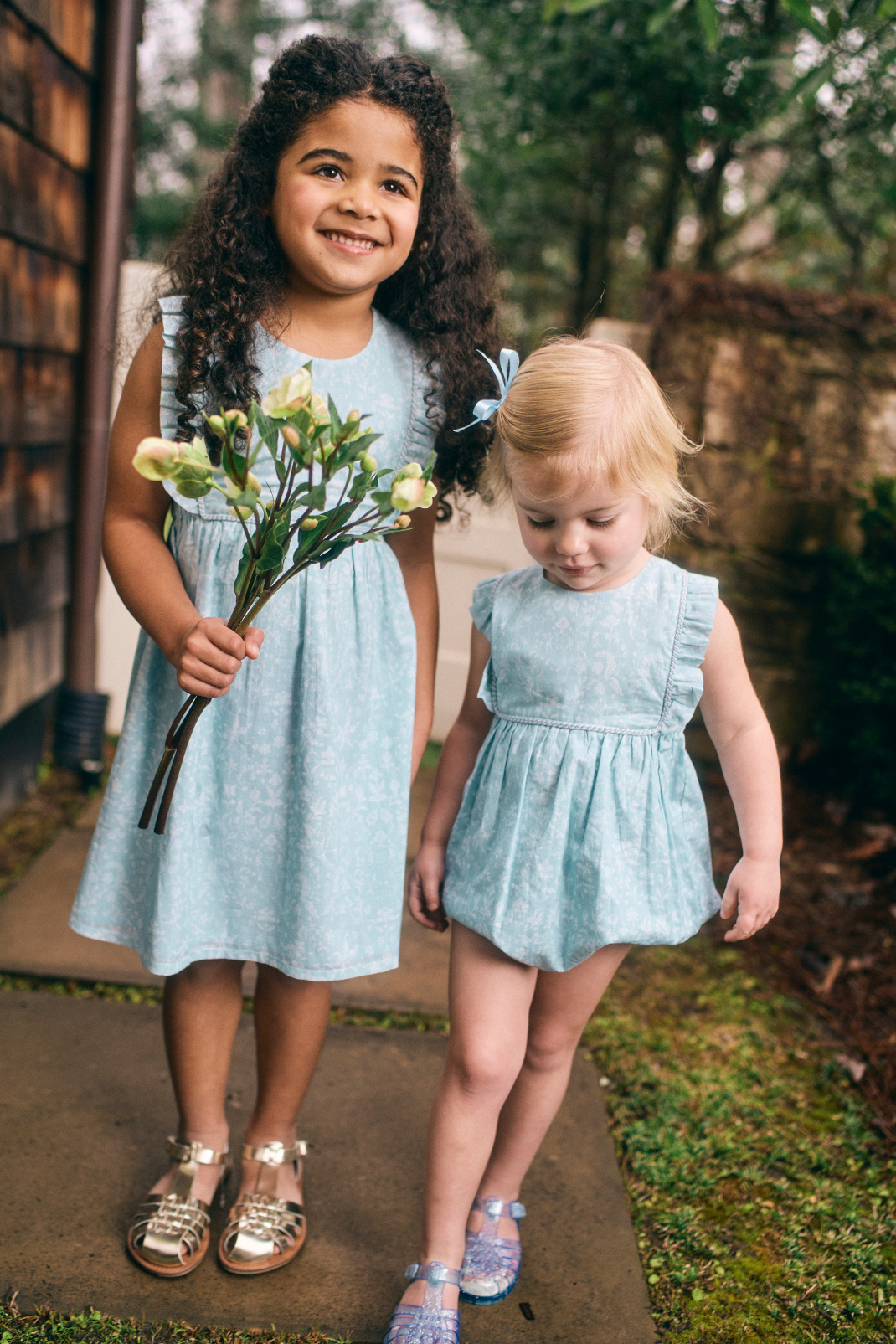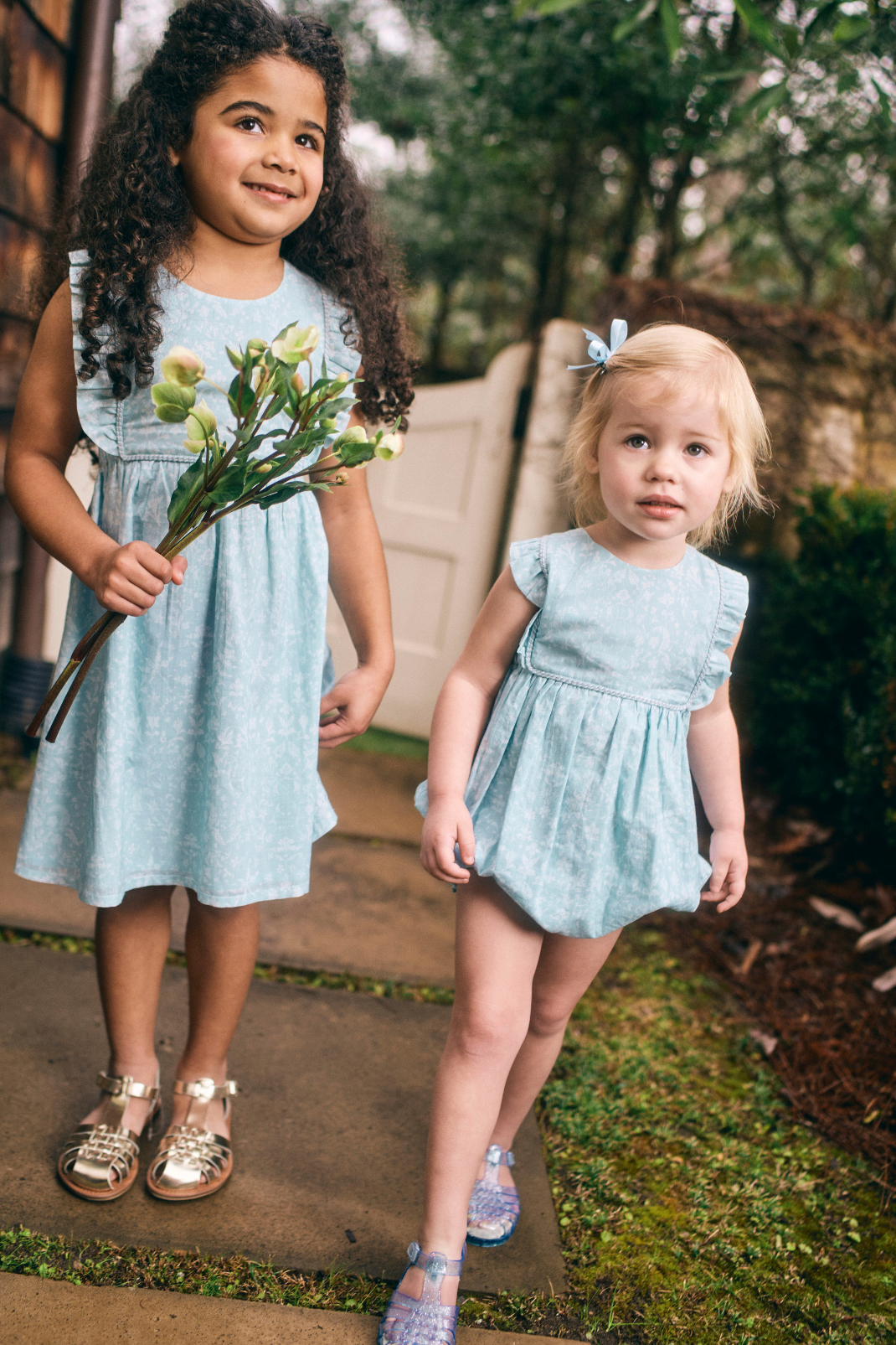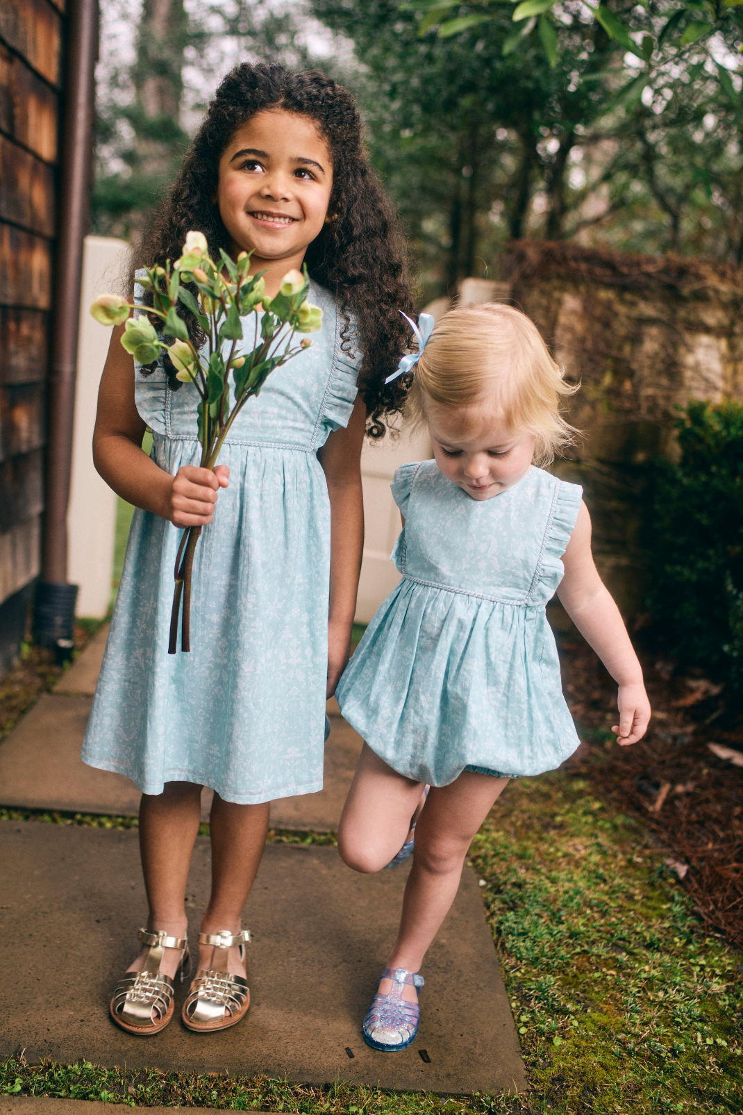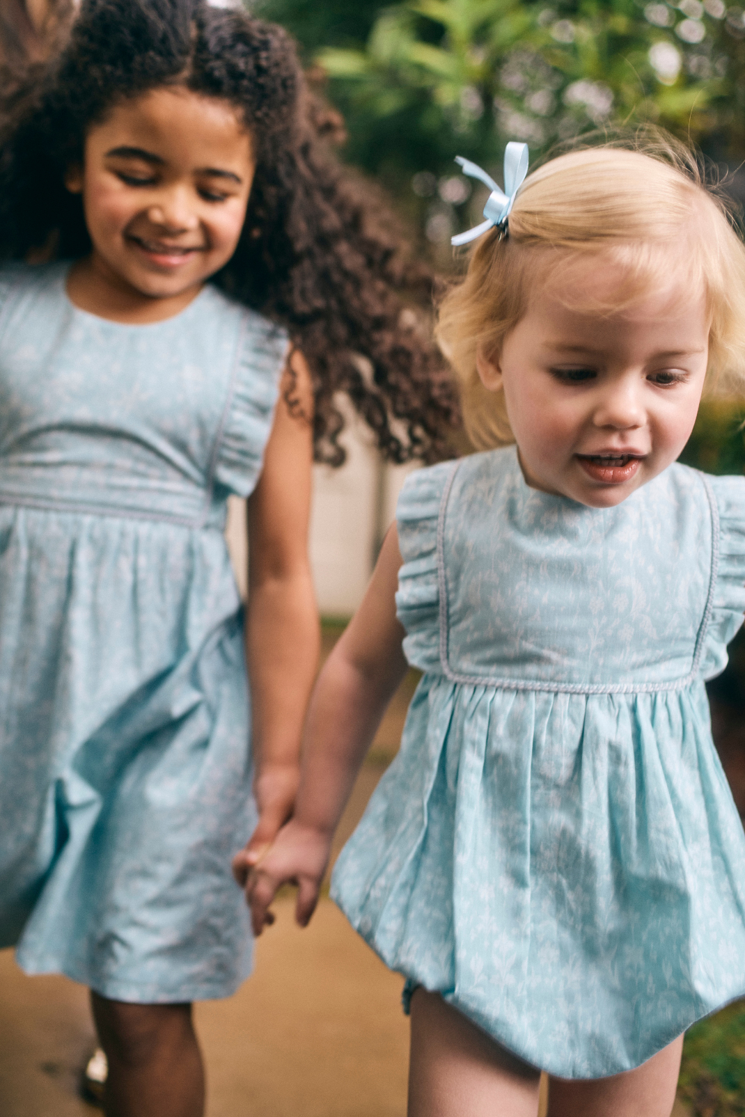 Two young girls in light blue floral dress  and bubble with ruffled bib and straps