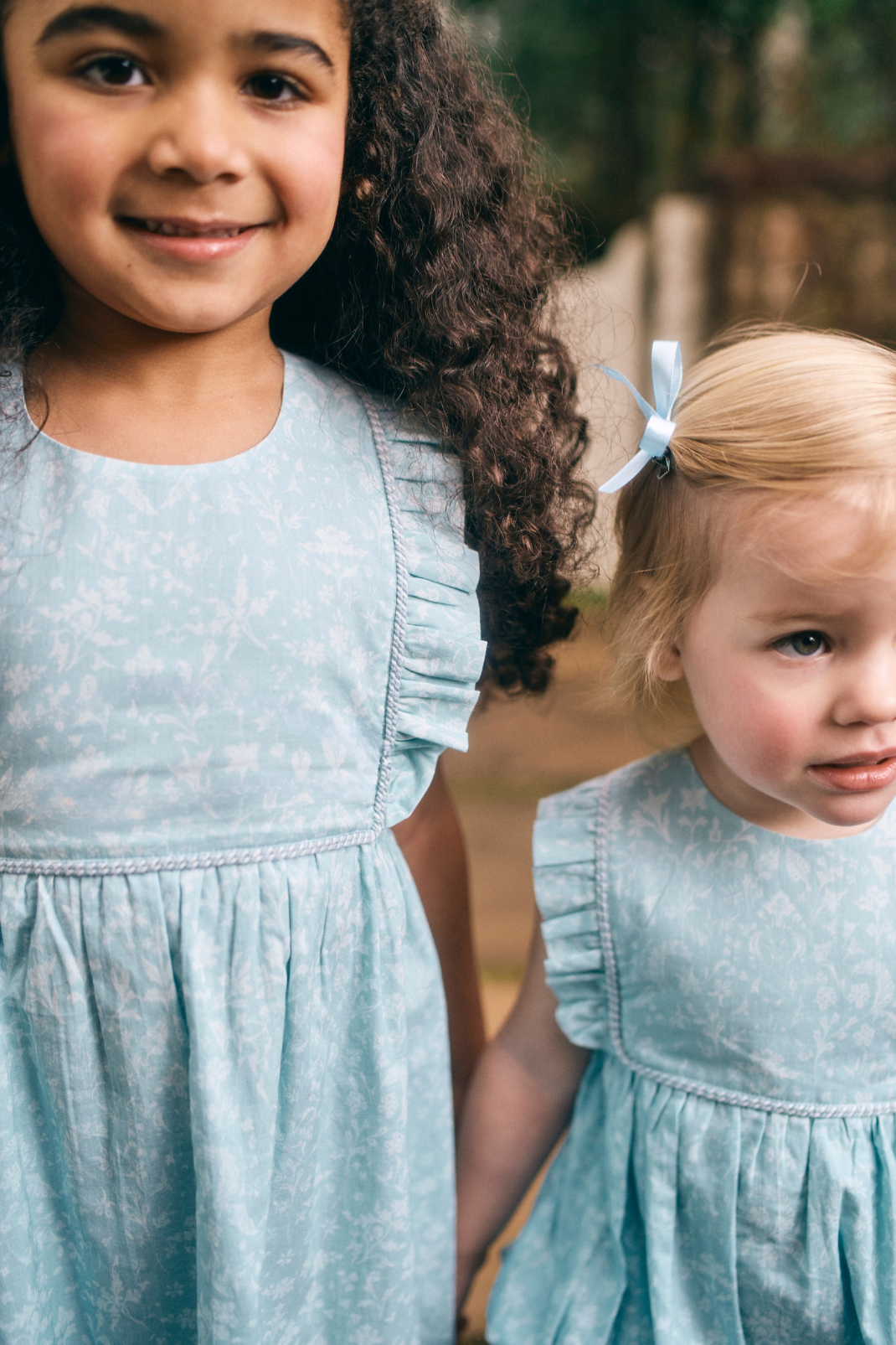 Two young girls in matching light blue floral dress and bubble