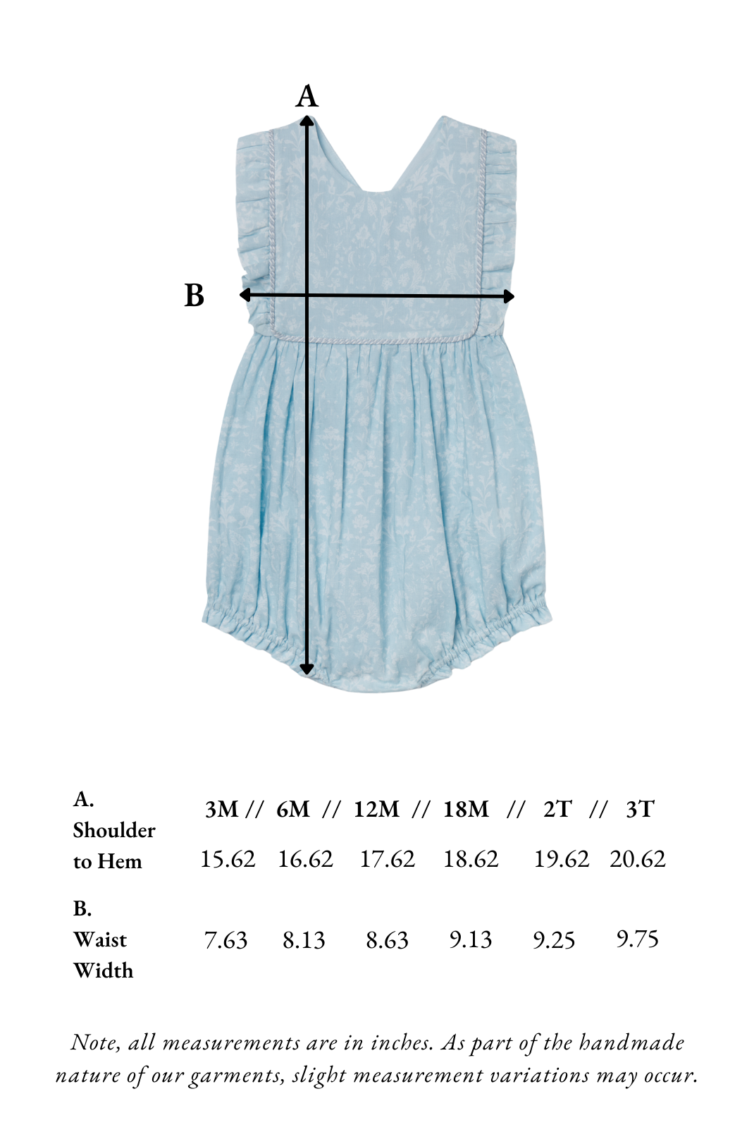 Size chart for a light blue floral baby bubble