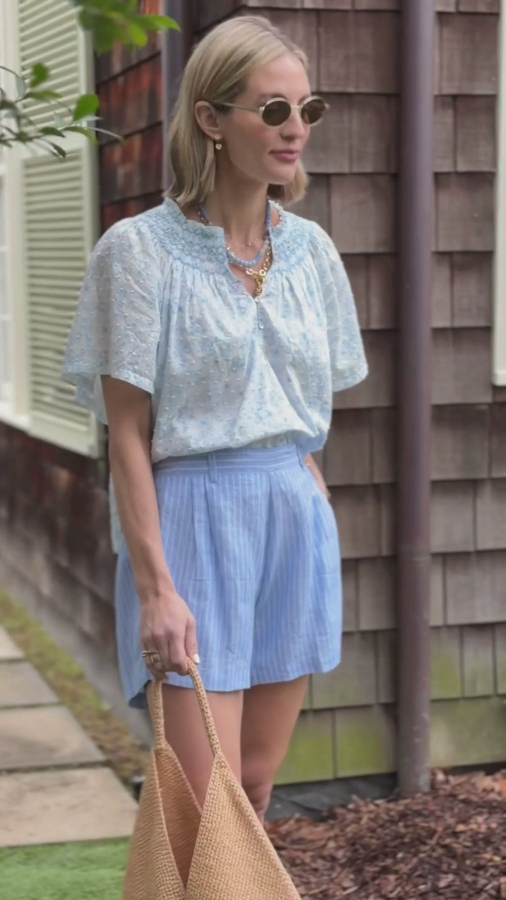 Video of a woman wearing a blue and white floral blouse with smocked neckline.