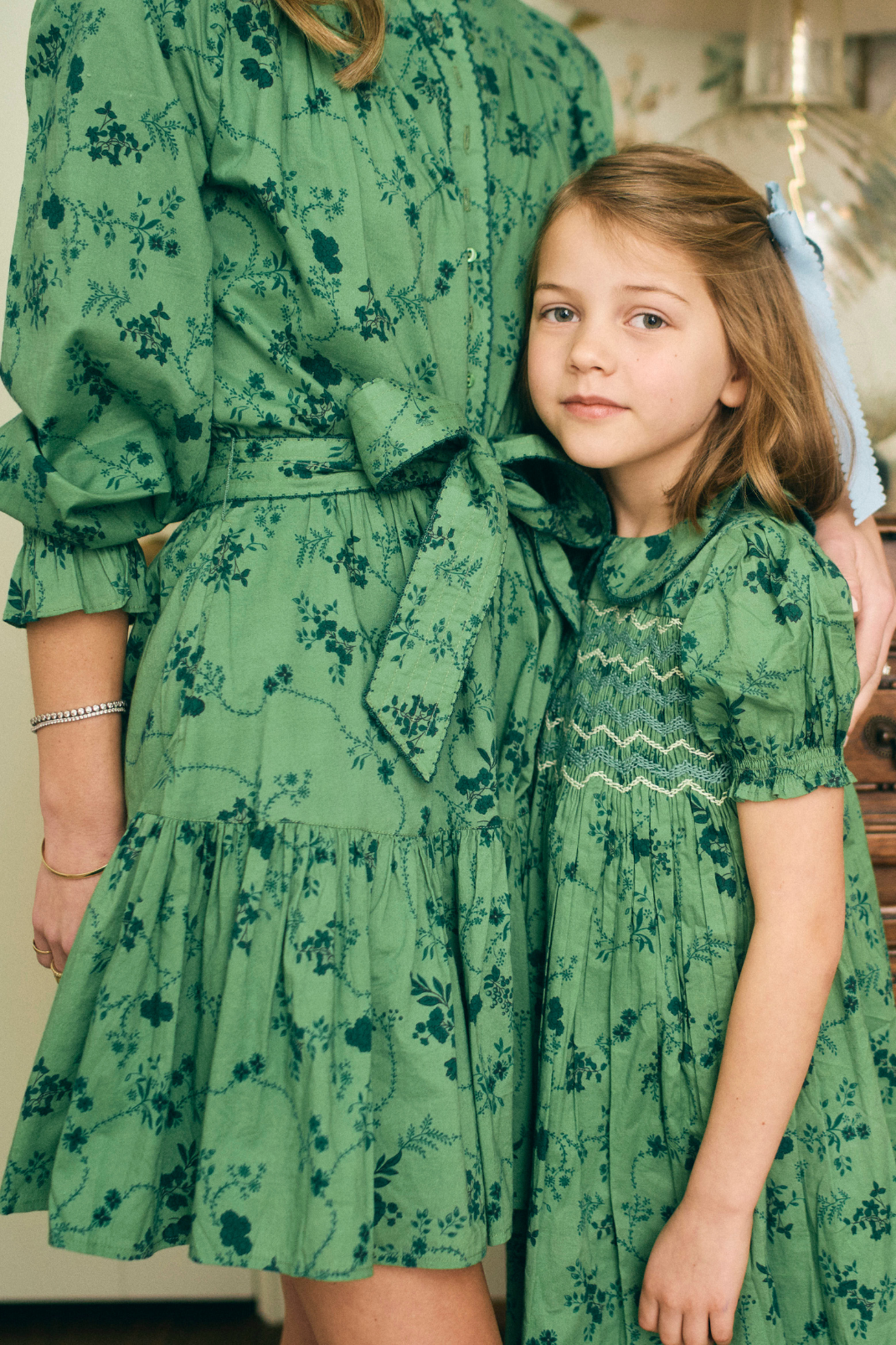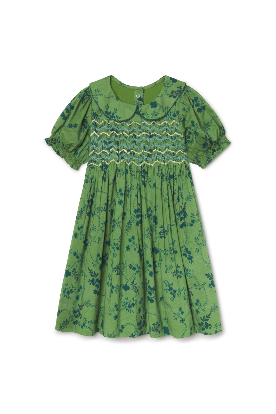 Close-up of a girls dress in green floral fabric with contrast smocking.