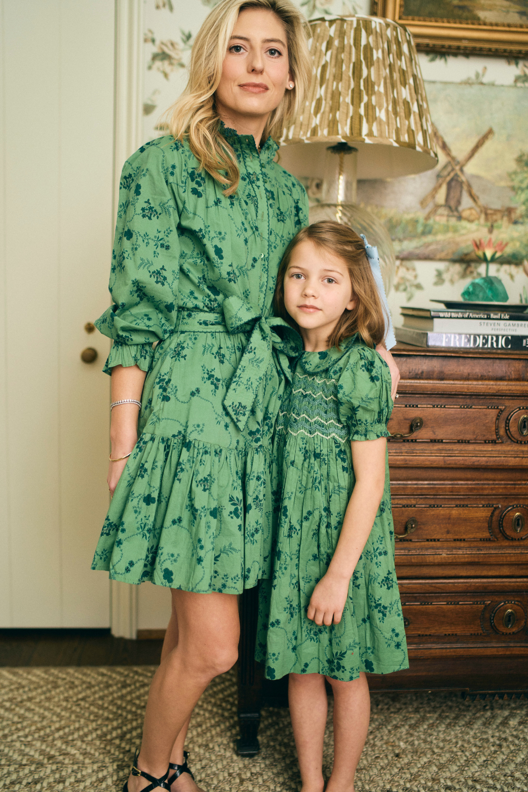 Two children in green outfits sitting on a tufted bench in a room with floral wallpaper.