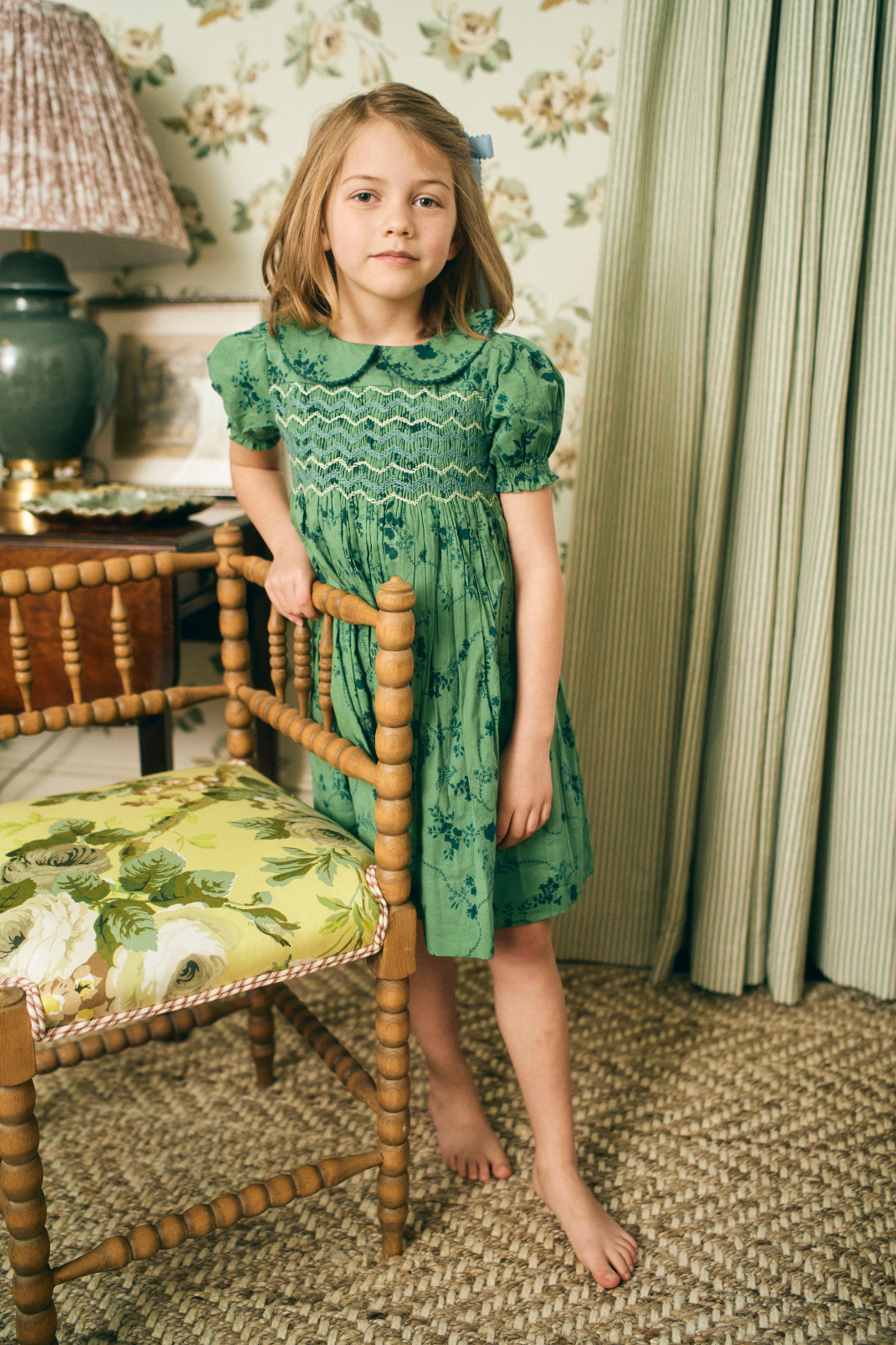 Little girl wearing a green floral dress with contrast smocking.