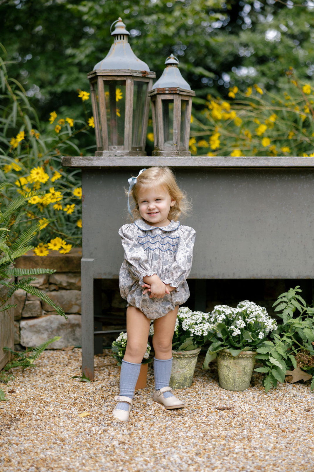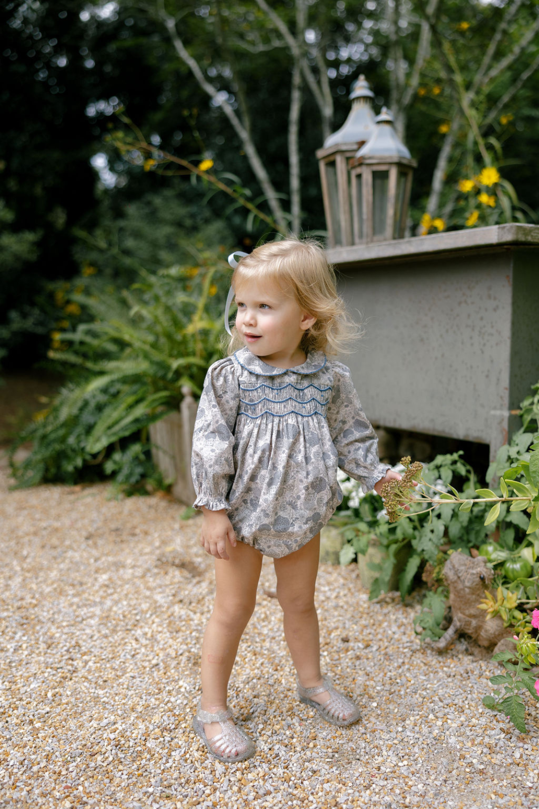 The Clara Bubble in Dahlia Daze is full of heirloom charm, with hand-smocking, a woven loop-trimmed collar, and softly puffed sleeves. It’s the long sleeve version of our Emmy Bubble, perfect for special moments but comfy enough for everyday.