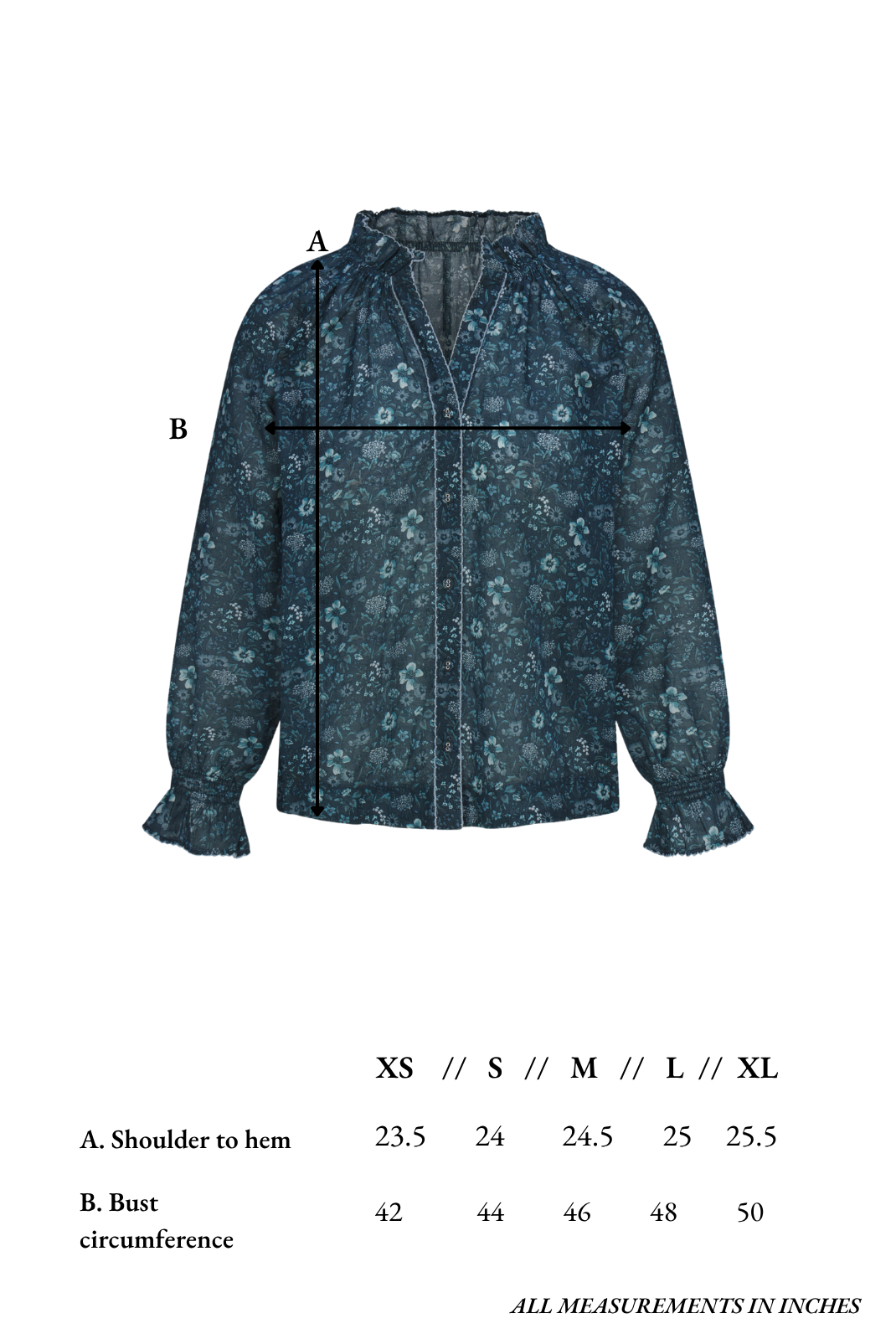 A moody floral that wears like a neutral. The Harper Top in Midnight Meadow features a swingy silhouette with delicate trim, fabric-covered buttons, and just enough romantic edge thanks to its ruffled collar. The deep navy base makes this print endlessly versatile—equally suited for mornings at the café or an evening glass of wine with friends.