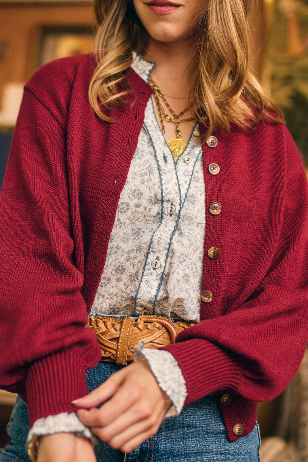 Our Jen Cardigan in Merlot is the ultimate fall wardrobe piece—rich in color, tailored in fit, and endlessly versatile. Designed to be worn layered or solo, its gently fitted waist adds shape when paired over dresses, while the billowy sleeves and soft ribbed knit keep it feeling casual and comfortable. Faux horn buttons and a flattering scoop neckline elevate the look, making it as suited for workdays as it is for weekends.
